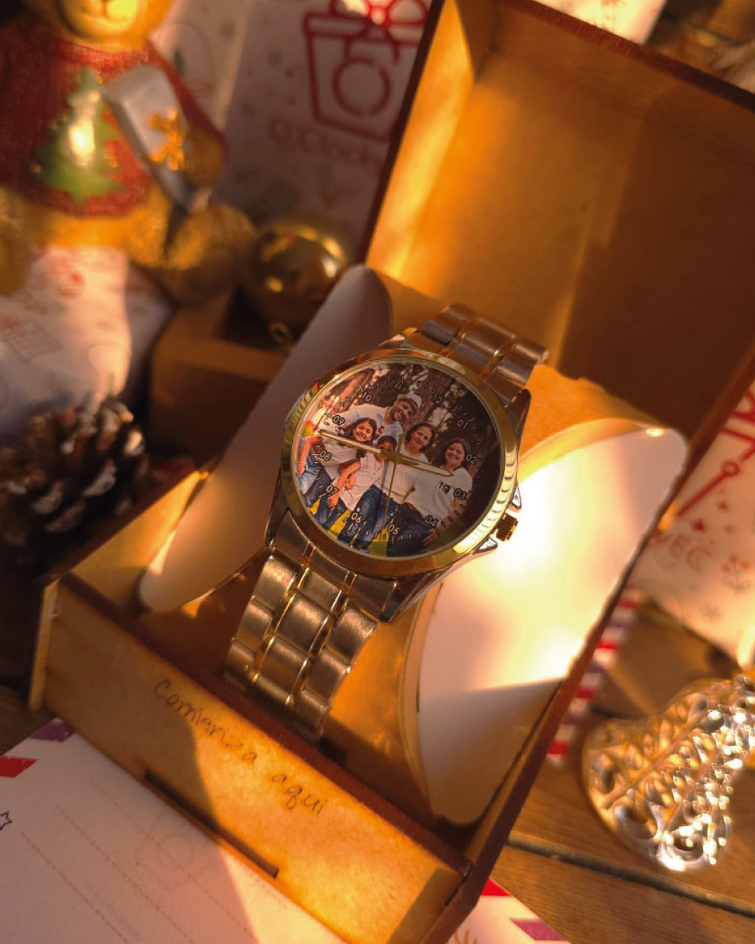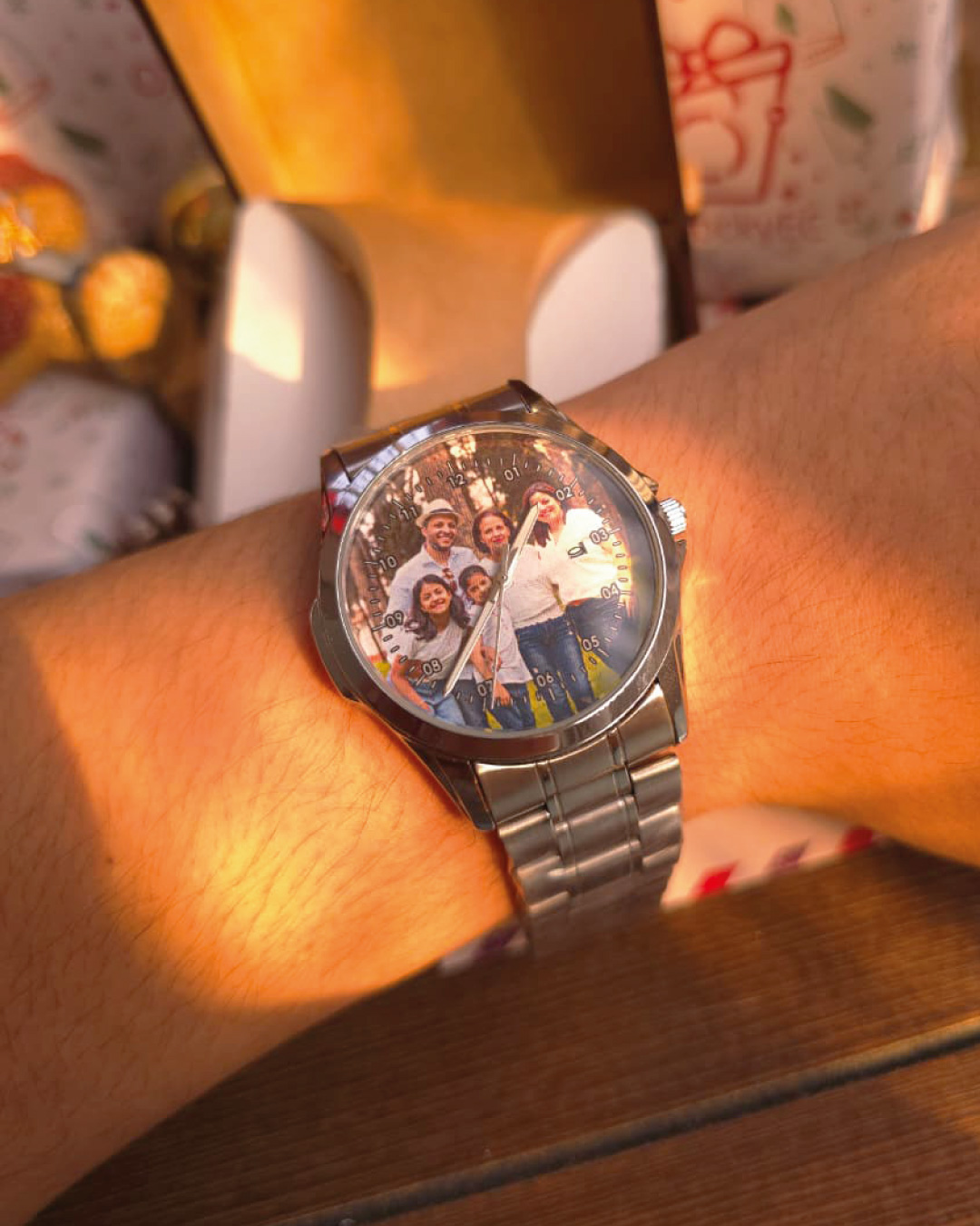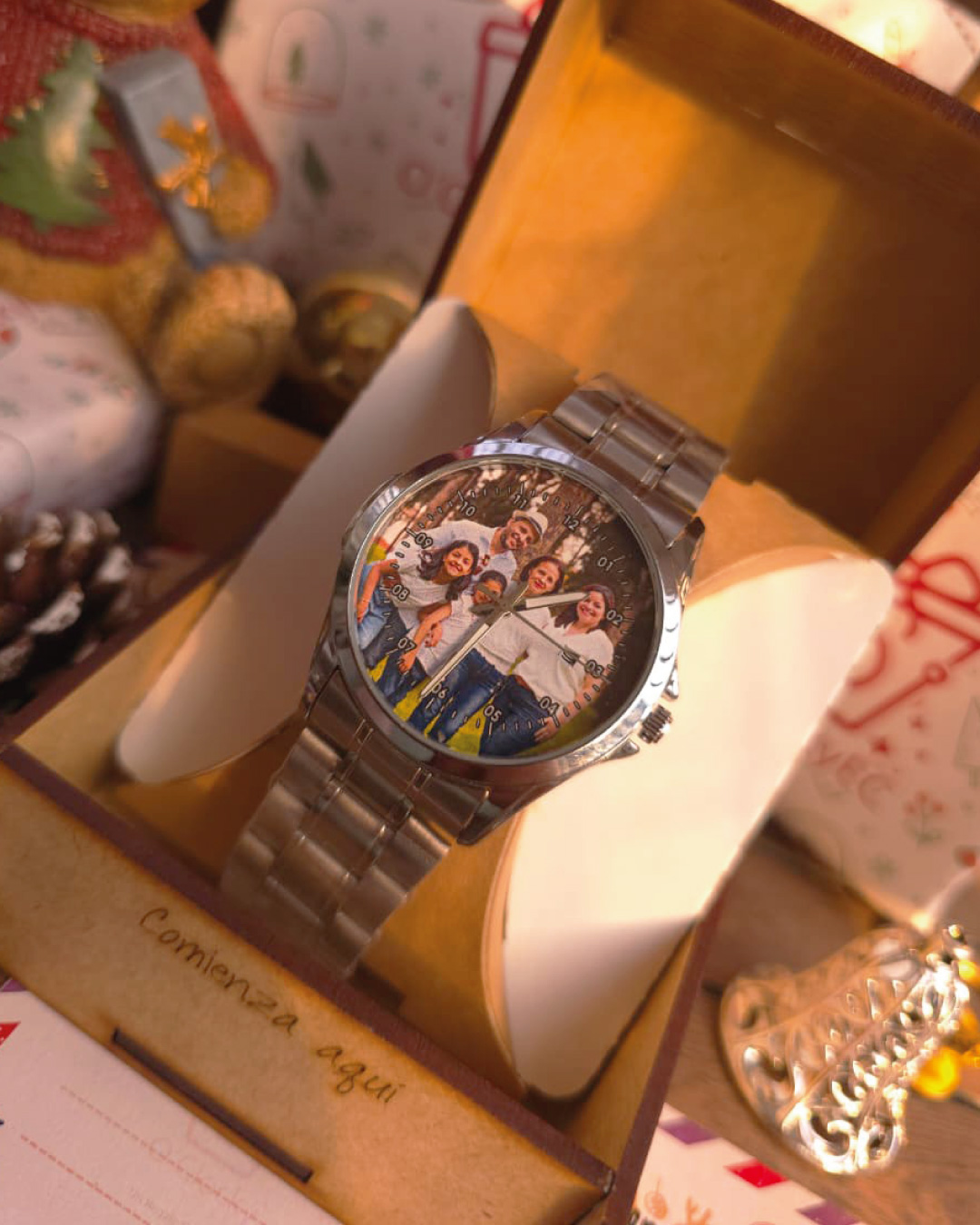 La esfera del reloj se convierte en un lienzo personal donde puedes imprimir una foto que represente un momento importante, ya sea la familia, la pareja, los hijos o un recuerdo que desea conservar siempre cerca. Su estructura de acero inoxidable garantiza resistencia, brillo y un acabado premium que destaca en cualquier ocasión, desde el día a día hasta eventos formales.